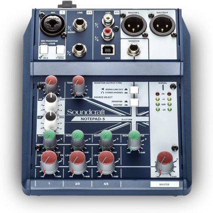 Das Soundcraft Notepad-5 ist ein kleines und handliches Kompaktmischpult mit einem USB Interface. Ausgestattet ist das Notepad-5 mit einem Mono-Kanal mit hochwertigem Mic/Line Preamp sowie zwei Stereokanaälen (1x Klinke, 1x RCA Chinch). Im Mischpult wurde ein Ausio-Interface verbaut, um ein Playback vom Computer einzuspielen oder um ein 2-Spur USB-Recording vor zu nehmen. Als Outputs hat der Mixer XLR-Summenausgänge, sowie einen Kopfhörer Ausgang. Daher ist das Kompaktmischpult perfekt für Podcaster, Sänger/Songwriter, Karaoke-Bars oder AV-Professionals.