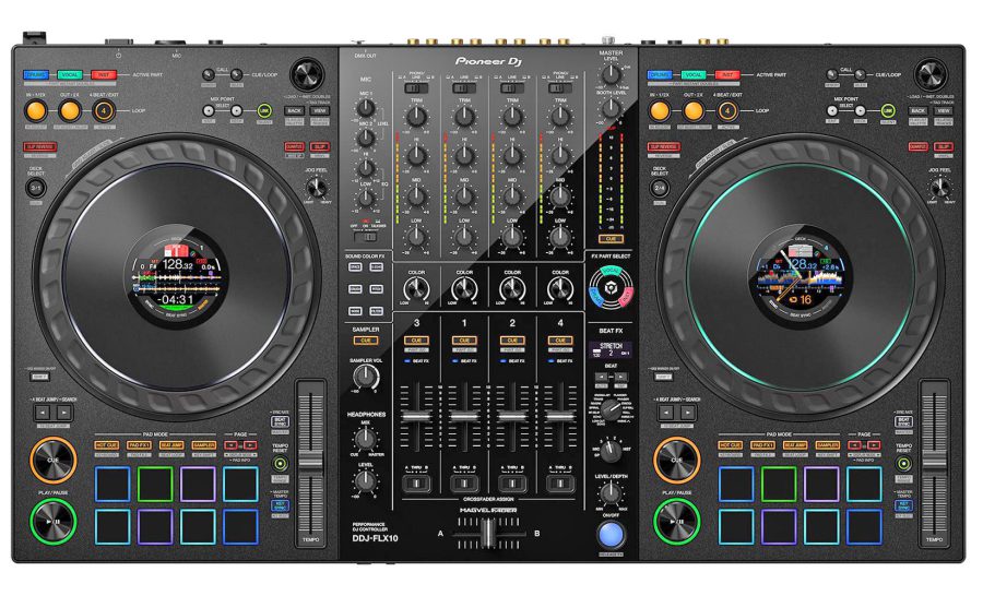 Mit dem brandneuen Pioneer DJ DDJ-FLX10 hebst du deine Mixes auf die nächste Stufe. In diesen Controller ist die Arbeit und Evolution der letzten Jahre eingeflossen, um dir den ultimativen 4-Kanal Controller in die Hand zu geben, der sowohl mit rekordbox, wie auch mit Serato DJ arbeitet.Erstmal ins einem Pioneer Controller verbaut: Das Track Separation Feature. Mit dieser intuitiven Funktion kannst du Tracks aus deiner Bibliothek laden, und dann Vocals, Drums und Instrumente voneinander trennen für innovative Remixes und Mash-Ups.Damit du jederzeit den Überblick behältst, wurden die On-Jog Displays erweitert. Du kannst nun aus insgesamt 4 Modi wählen: Deck Info Modus, Wellenform-Modus, Artwor-Anzeige und DJ Logo. Natürlich bieten die großen 170 mm Jogwheels präzise Kontrolle und Feinjustierung über die Track-Position, wie man es von Pioneer DJ gewohnt ist. Mit dem Feeling-Adjust Regler können die Jogwheels an die persönlichen Bedürfnisse angepasst werden.Auch der MAGVEL-Fader wurde überarbeitet. Dank dem 4-Sensor-System arbeitet dieser präziser und smoother als je zuvor. Ebenfalls brandneu an Bord: Mix Point Link. Mit diesem Feature kannst du Sets so komfortabel und präzise wie nie zuvor erstellen, indem du in deinem Track einen Mix Point setzt, von dem aus der Track dann automatisch und perfekt im Beat startet.Erstmals in einem Pioneer Controller verbaut ist auch der DMX-Ausgang. Hiermit hast du die Kontrolle über die Lighting Features von rekordbox für die perfekte Lichtshow bei deinem Set.Der FLX-10 kommt im vertrauten Pioneer Club Layout und bietet alle Performance Features auf vollen 4 Decks, die ein DJ braucht: 2x8 Performance Pads, umfangreiche Mixer-Sektion, 6 Sound Color FX, 14 Beat FX und auch 2 USB-C Ausgänge für den gleichzeitigen Einsatz auf 2 verschiedenen PCs/Laptops.Der Controller fungiert als Dongle und schaltet bei Anschluss automatisch rekordbox DJ und Serato DJ Pro frei. Eine kostenpflichtige Upgrademöglichkeit auf den DVS-Support ist jederzeit möglich.Der Pioneer DJ DDJ-FLX10 ist der ultimative 4-Deck Controller für Performer, Remixer und professionelle DJs, der keine Wünsche offen lässt.
